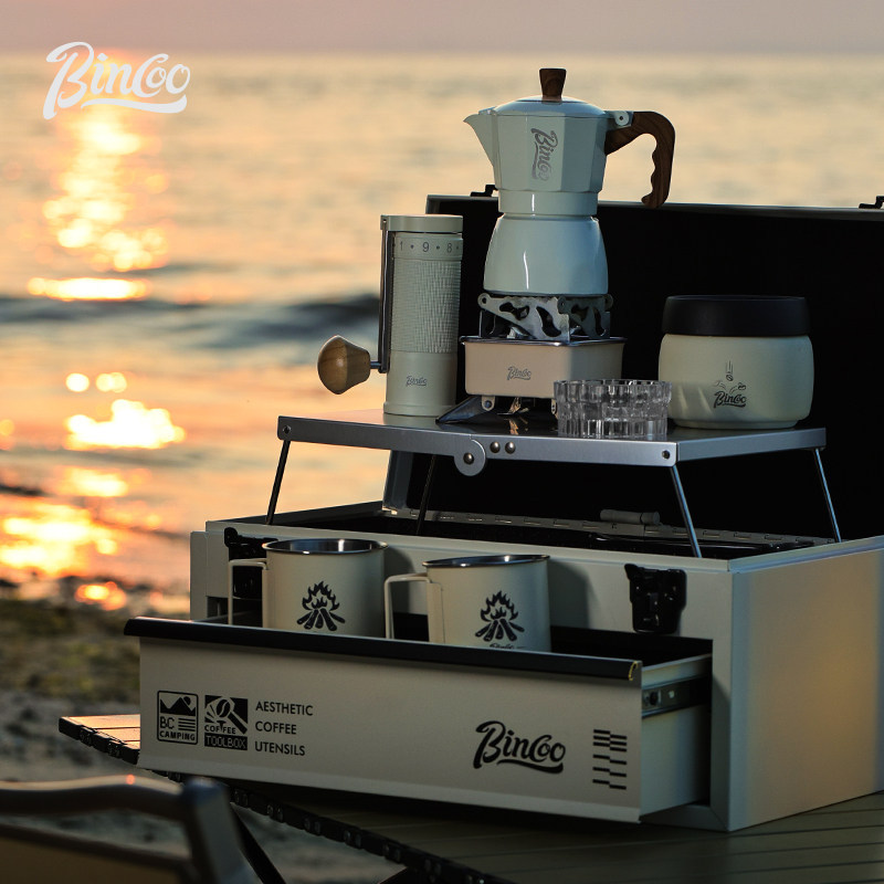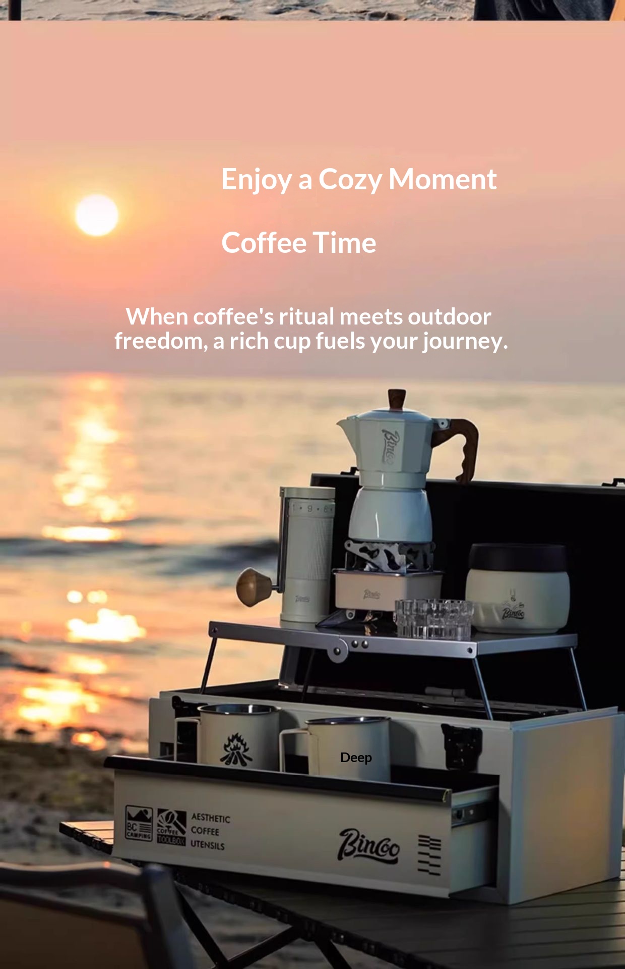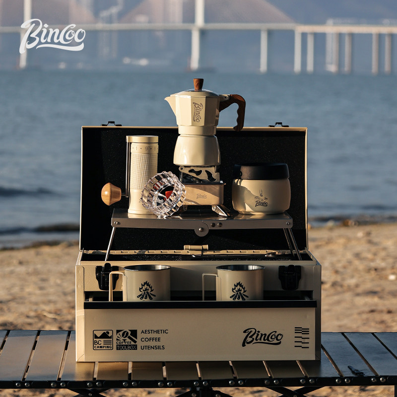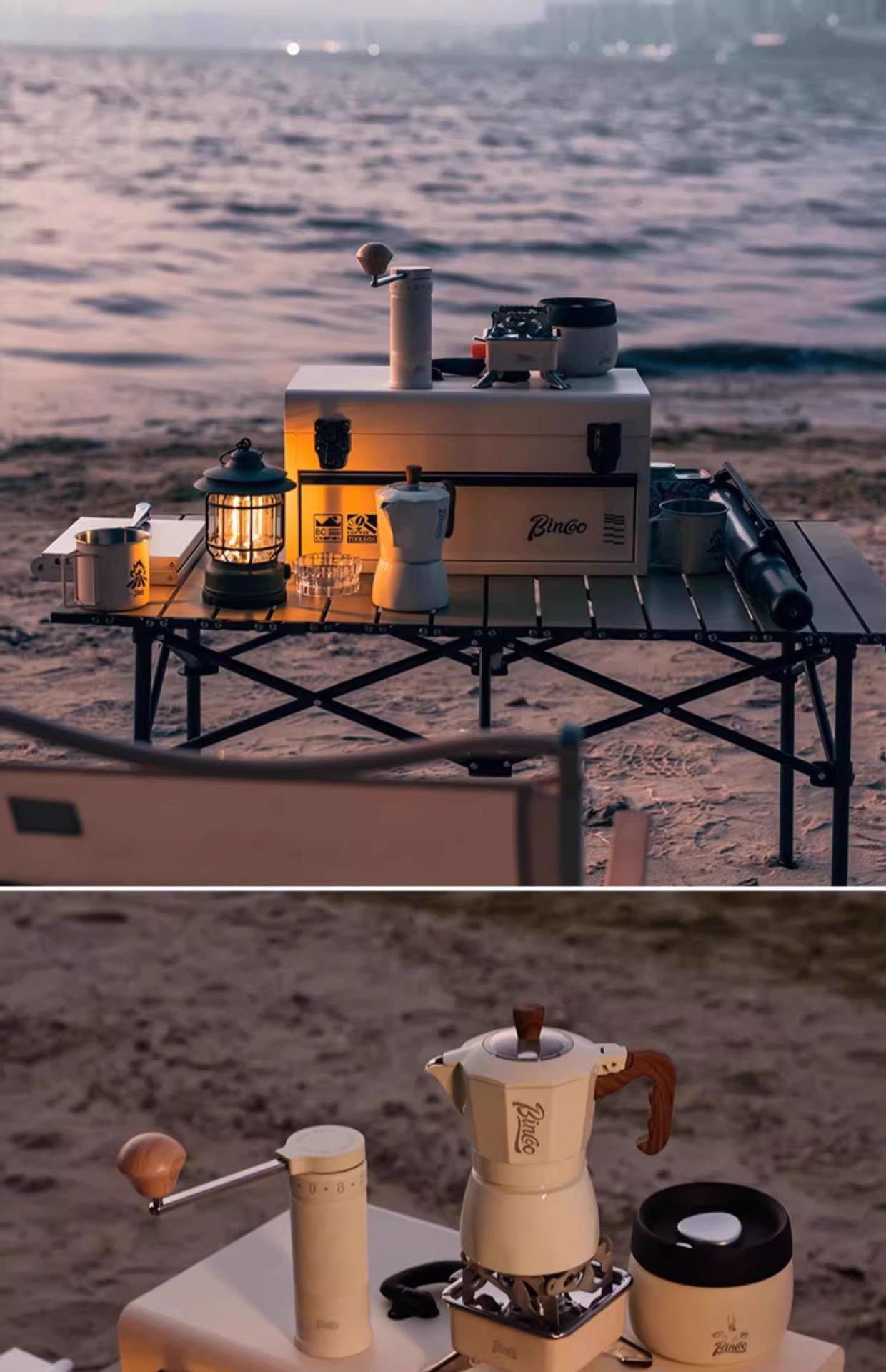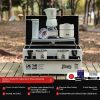 Brew rich, authentic Moka pot coffee anywhere with this portable camping set. It includes a durable Moka pot, burner, and accessories, all neatly packed for easy transport. Enjoy cafe-quality coffee outdoors, simplifying your brewing process and elevating your camping experience. Its compact design and complete set make it a unique and convenient solution for coffee lovers on the go.