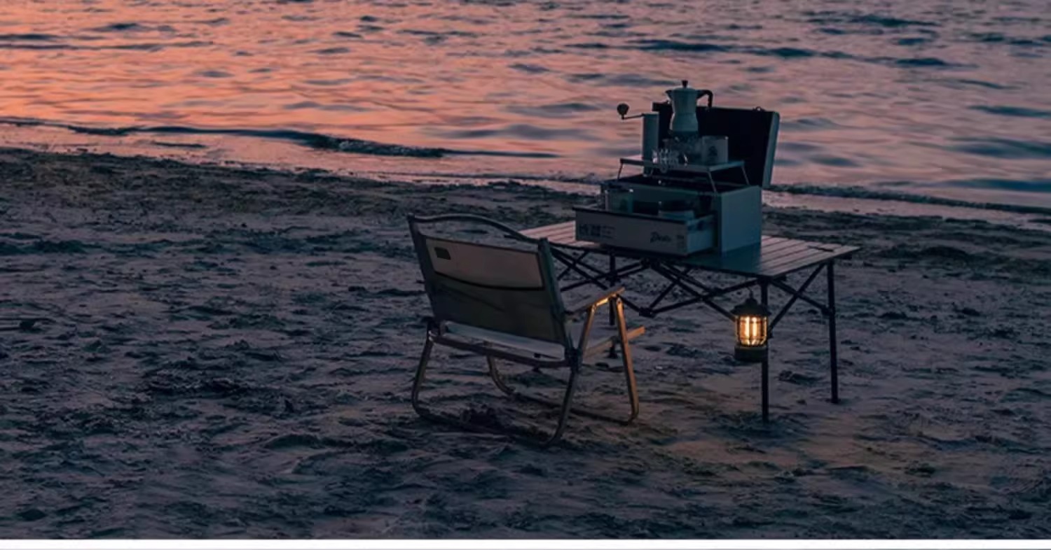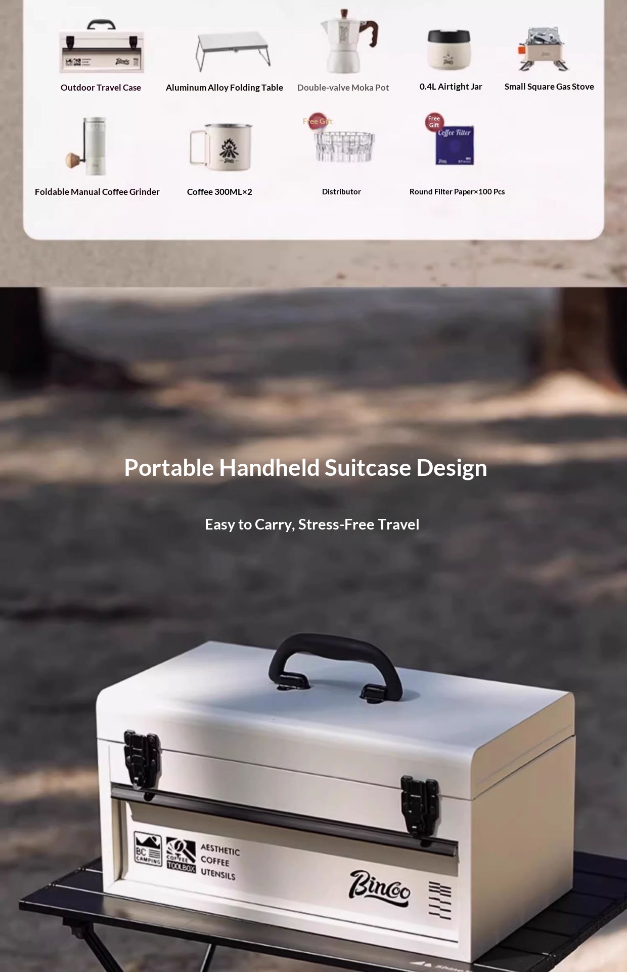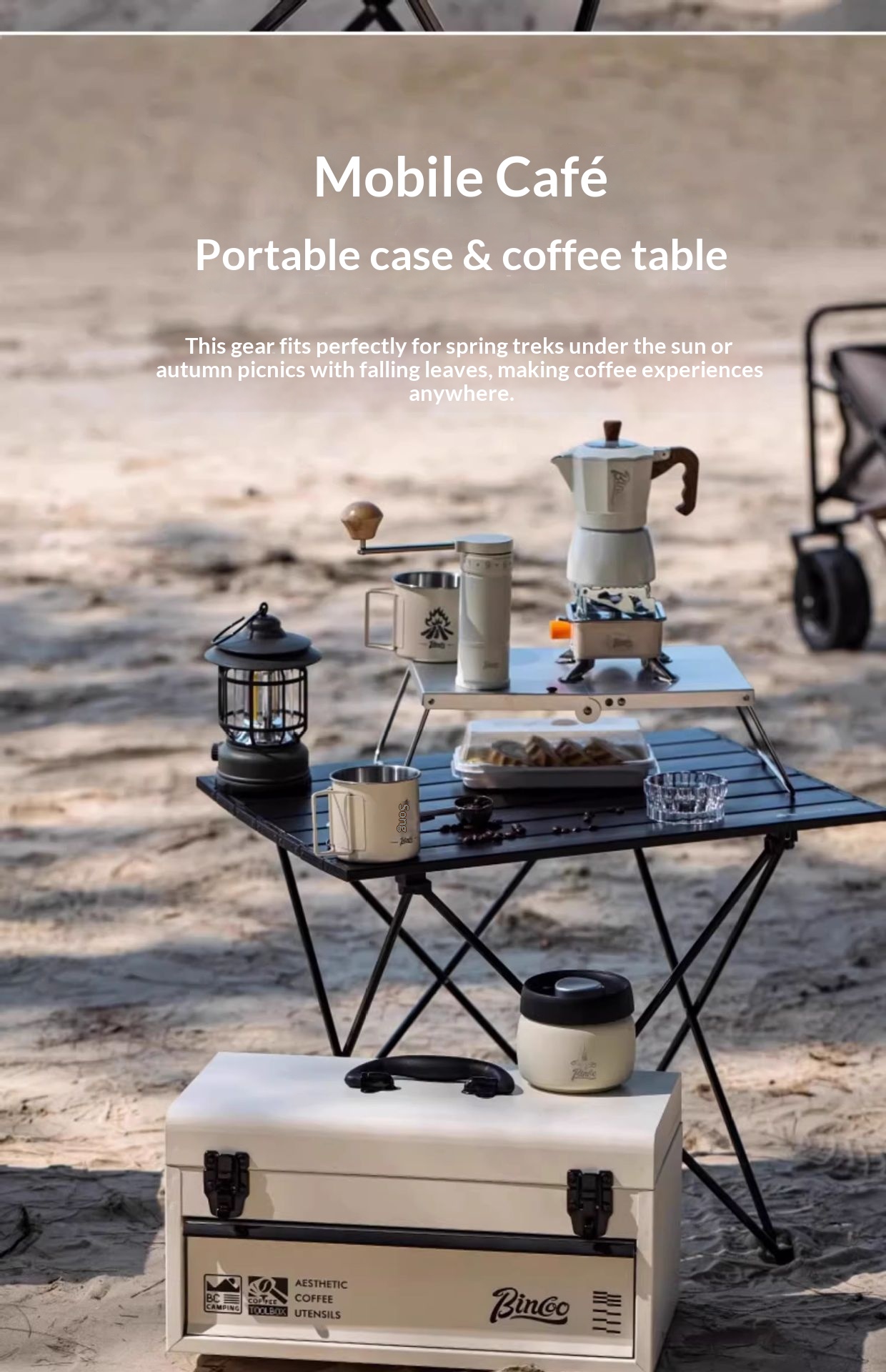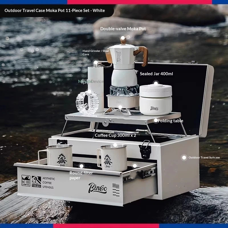 Brew rich, authentic Moka pot coffee anywhere with this portable camping set. It includes a durable Moka pot, burner, and accessories, all neatly packed for easy transport. Enjoy cafe-quality coffee outdoors, simplifying your brewing process and elevating your camping experience. Its compact design and complete set make it a unique and convenient solution for coffee lovers on the go.